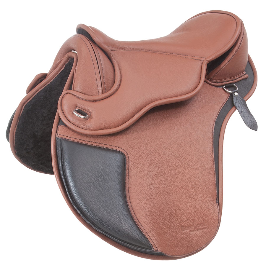Satula on valmistettu pehmeästä nahasta ja yhdistetty helppohoitoiseen DryTex®-materiaaliin pohjassa. Paksu tekoturkisalapuoli lisää käyttömukavuutta. Tarrakiinnitteiset polvituet ovat säädettävissä ratsastajan mieltymysten mukaan.