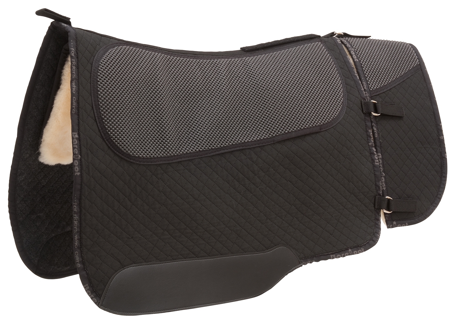 2 in 1 -alusta – jokapäiväiseen käyttöön ja kiinnitettäväksi satulalaukkujen alleToimitus sisältää 2 erilaista paria täytteitä! Kehitetty pitkien maastolenkkien vaatimuksiin, irrotettavalla suojakiinnikkeellä satulalaukkujen käyttöä varten. Kiinnike on vuorattu aidolla lampaannahalla, joka suojaa hevosta ja ehkäisee hiertymiä. Tarrakiinnitysten ansiosta osa on helppo ja nopea irrottaa, joten alustaa voidaan käyttää myös ilman sitä jokapäiväisessä ratsastuksessa. Tämä poistaa tarpeen hankkia kahta erilaista satulahuopaa. Barefoot® 'Physio Trailpad' sopii kaikkiin Barefoot®-satuloihin, mutta on erittäin toimiva myös perinteisten satuloiden alla ominaisuuksiensa ansiosta: Kaikki 'Physio Trailpad' -alustat on muotoiltu hevosen selkärangan mukaan ja ne tarjoavat ihanteellisen iskunvaimennuksen ja paineen jakautumisen. Järjestelmä tarjoaa lisätilaa rintarangan okahaarakkeiden yläpuolelle ja koostuu kahdesta paineita vaimentavasta osasta, jotka on yhdistetty tukevasti tarranauhalla.a) Alaosa: anatomisesti muotoiltu, tikattua puuvillaa, ohennettu reisituen kohdalta läheisen jalkakontaktin takaamiseksi, paineita vaimentavat vaahtomuovitäytteet voidaan poistaa helposti tarranauha-aukon kautta. 2/3 sympanova-pintaa alapinnassa vakauttaa satulan myös hyvin pyöreillä hevosilla – takaosan 1/3 on vuorattu lampaannahalla tämän herkän alueen suojaamiseksi. Lampaannahka liukuu hevosen karvaa vasten ja ehkäisee siten mahdollisia hiertymiä takakaareen kohdistuvalla alueella. Lisälampaannahkaa edessä vaimentamassa lapojen liikettä.b) Yläosa: tikattua puuvillaa tai mikrokuitukangasta, huopavuori alapuolella, polyfleece-sisus ja sympanova-kerros päällä (pitää satulan paikallaan, tarjoaa lisäiskunvaimennusta ja mahdollistaa jonkin verran ilmankiertoa). Tarralenkit alustan kiinnittämiseksi satulaan. Pakkaukseen sisältyy 2 paria 15 mm anatomisesti muotoiltuja vaahtomuovitäytteitä: Pehmeä (PU-vaahto) – mukautuu hyvin; tiivis (kumivaahto): raskaammille ratsastajille • irrotettava kiinnike• anatominen muotoilu• tarjoaa selkärangantilaa myös herkille hevosille, joilla okahaarakkeet erottuvat selvästi• hyvin pehmustettu, sopii myös raskaammille ratsastajille• liukumaton• sisältää kaksi erilaista paria täytteitä Saatavana kahtena eri mallina: Koko A kaikille satuloille, joissa on pidemmät satulaläpät, kuten Barefoot®-satulat Barrydale, London, Lexington, Barrydale, Cheyenne, Cherokee, Nottingham, Nevada, Madrid. Väri musta, yläpuolella tikattu puuvillavuori. Koko B kaikille satuloille, joissa on lyhyet sivuläpät, kuten Barefoot® Atlanta, Arizona, Happy Valley, Lazy Mountain, Missoula Nut, VirginiaRose. Väri ruskea, yläpuolella ruskea mikrokuituvuori.