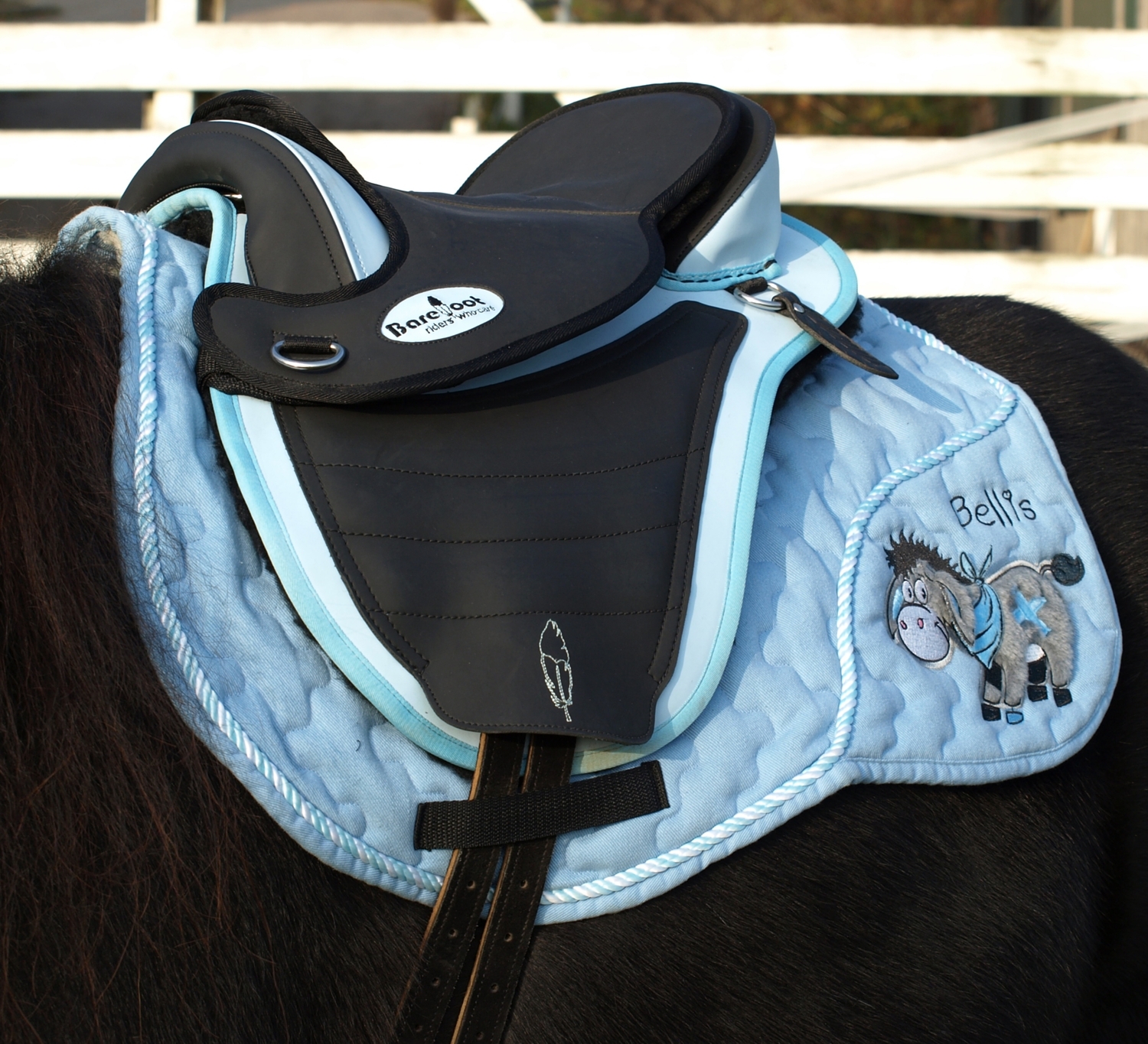 Erittäin söpö, topattu satulahuopa Barefoot® Cheyenne Bellis -satulaan tai muihin ponisatuloihin. Satulahuovassa Bellis on oikealla puolella pehmeä tasku makupaloille, kaviokoukulle ym.Lisämukavuutta ja -pehmustusta tuo aito villainen alapinta, joka tasaa lämpöä ja imee kosteutta.