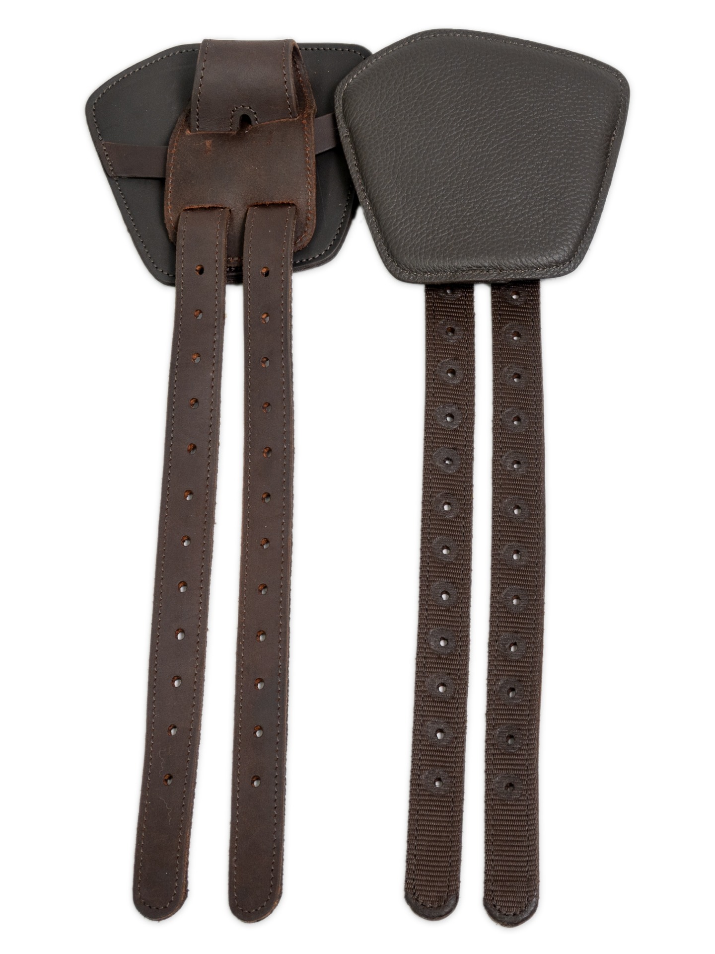 Käytännöllinen ratkaisu westernsatuloihin. Kaksi kiinnityshihnaa kulkee pehmeästä nahasta tehdyn pehmusteen läpi ja sen yli, mikä auttaa ehkäisemään karvan ärsytystä ja vähentää painetta herkällä vatsan alueella.